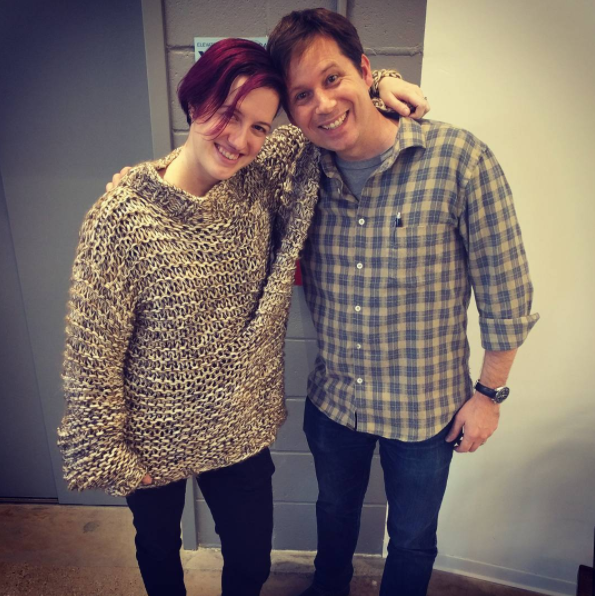 Ryn wearing the three-armed-sweater, with John Allspaw.